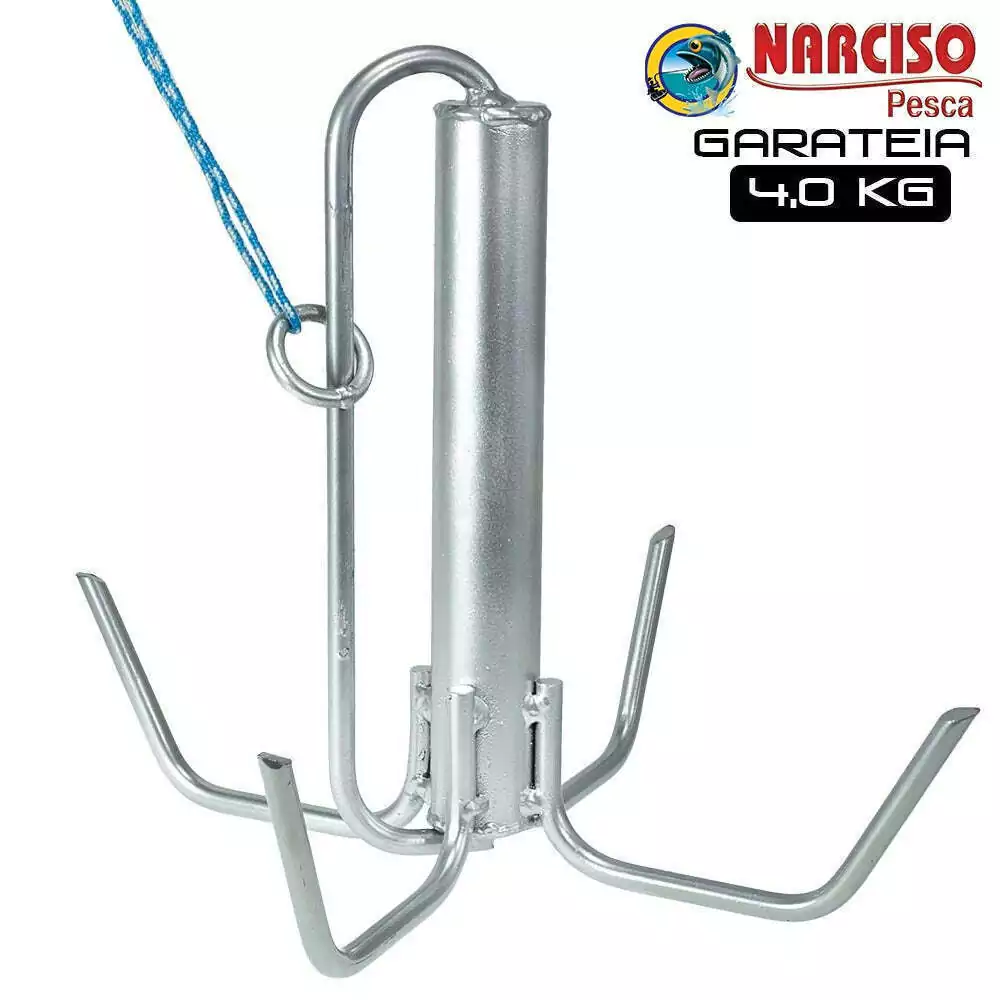 Especificações • Marca: Narciso Pesca • Material: Aço Fosfatizado, com preenchimento maciço • Dobrável: Não, garateias fixas e resistentes, ideais para áreas com pedras • Comprimento: 39,5 cm • Largura (garateia): 33 cm • Medida entre os ganchos: 24,5 cm • Peso: 4,0 Kg