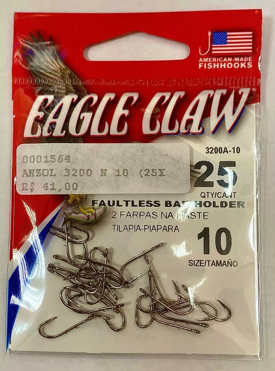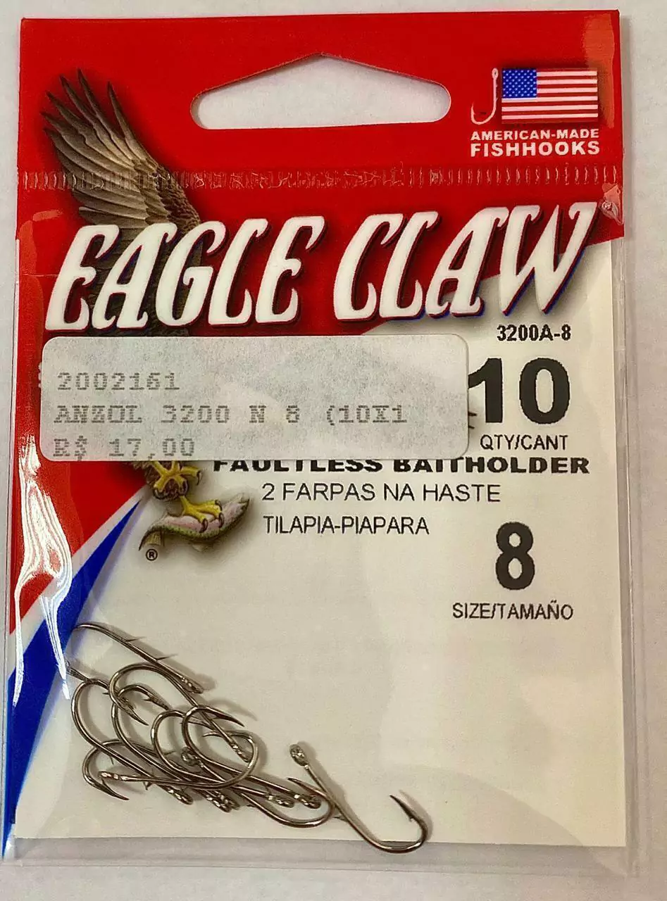 A americana Eagle Claw uma gigante na fabricação de anzóis e garateias, disponibiliza uma gama enorme de modelo o anzol referencia 3200 sem duvida é o modelo que é mais usado nas pescarias de piaus, pacus, tilápias e piaparas por inúmeros motivos, entre eles duas farpas em sua haste (unha de Gato) e ainda sua ponta com excepcional fisga e anti-enrosco e de alto poder de fisgada e penetração.