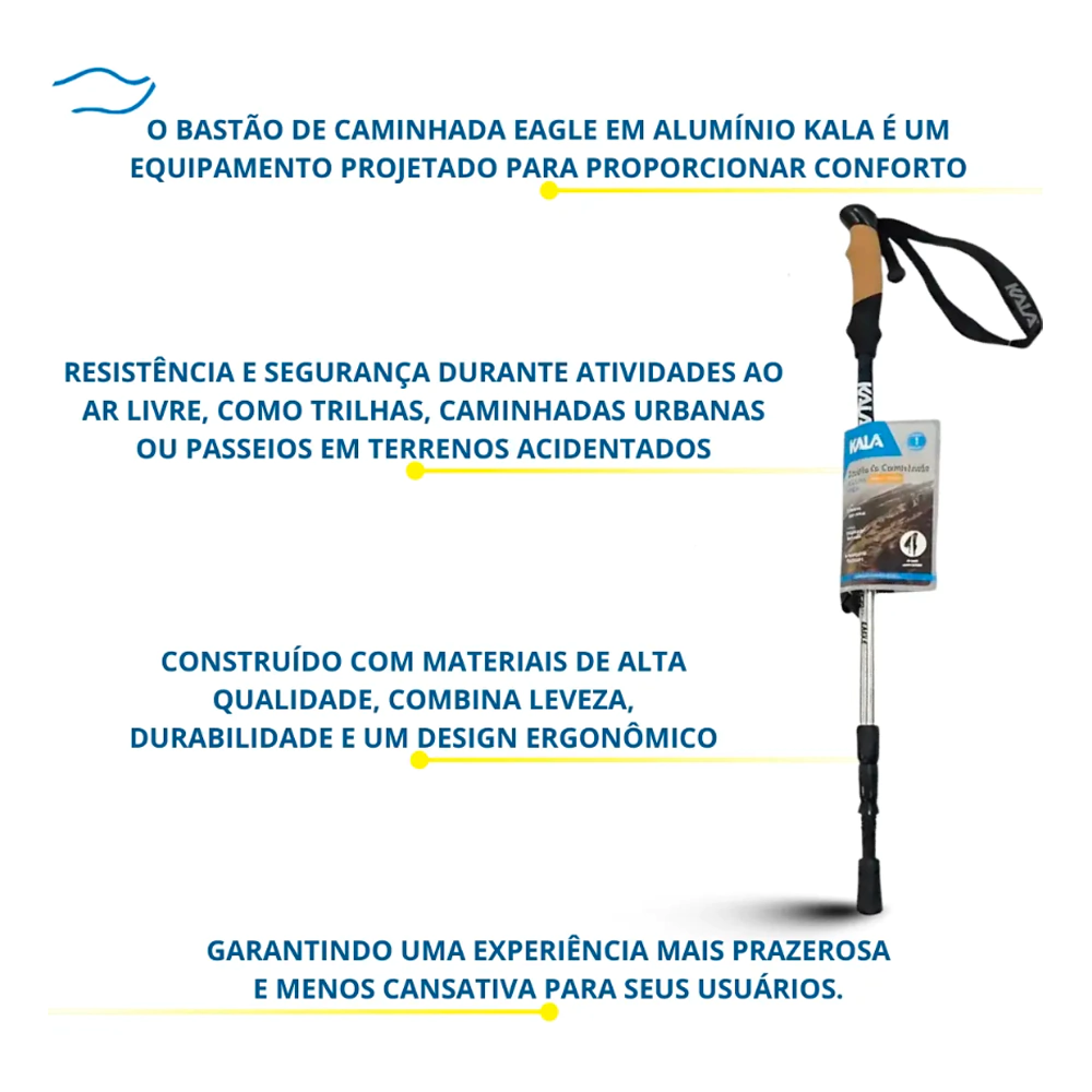 O Bastão de Caminhada EAGLE em Alumínio KALA é um equipamento projetado para proporcionar conforto, resistência e segurança durante atividades ao ar livre, como trilhas, caminhadas urbanas ou passeios em terrenos acidentados. Construído com materiais de alta qualidade, combina leveza, durabilidade e um design ergonômico, garantindo uma experiência mais prazerosa e menos cansativa para seus usuários.
