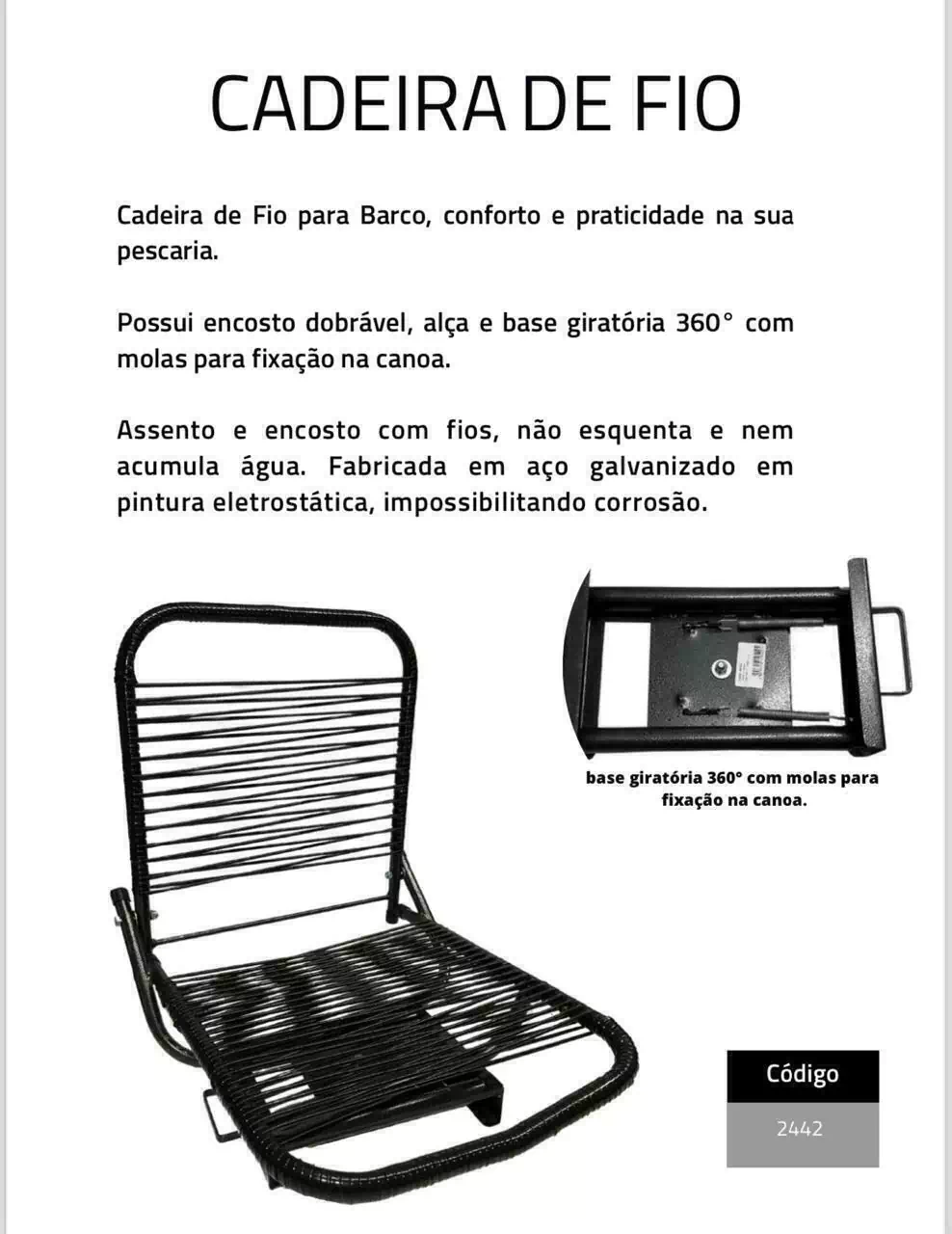 Além de giratória é dobrável, seu transporte para onde você for e muito fácil. Sua base giratória de 360o possui altura mínima em relação ao banco do barco e oferece segurança e comodidade.