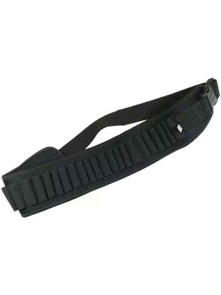 Cinturão usado para a guarda das munições, proporcionando segurança e facilidade no transporte, além de agilizar o seu uso, caso necessário. Confeccionado com neoprene revestido (rígido), contendo 25 compartimentos para as munições. Possui fivela tamanho grande e alça rígida, proporcionando mais segurança e robustez. Disponível no calibre 12.