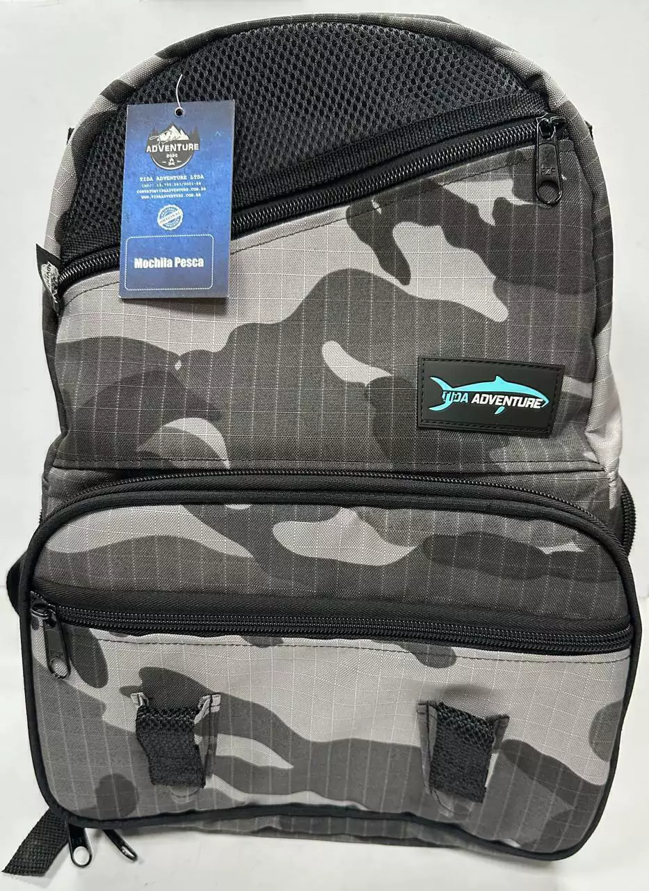 A Mochila de Pesca (MP) da Tida Adventure é confeccionada em tecido Ripstop tomando ela extremamente leve, durável e resistente a água. Pensada e desenvolvida para acompanhar o pescador em todos os lugares é capaz de organizar tudo de forma prática e segura. Na sua parte Interna acomoda até 4 estojos com dimensões C:27 L:15,5 A:4,2cm, e conta ainda com 02 Bolsos na sua lateral e 02 bolsos frontais com 02 porta alicates. À parte traseira é acolchoada garantindo conforto. As Alças de Ombro são reguláveis e super reforçadas.