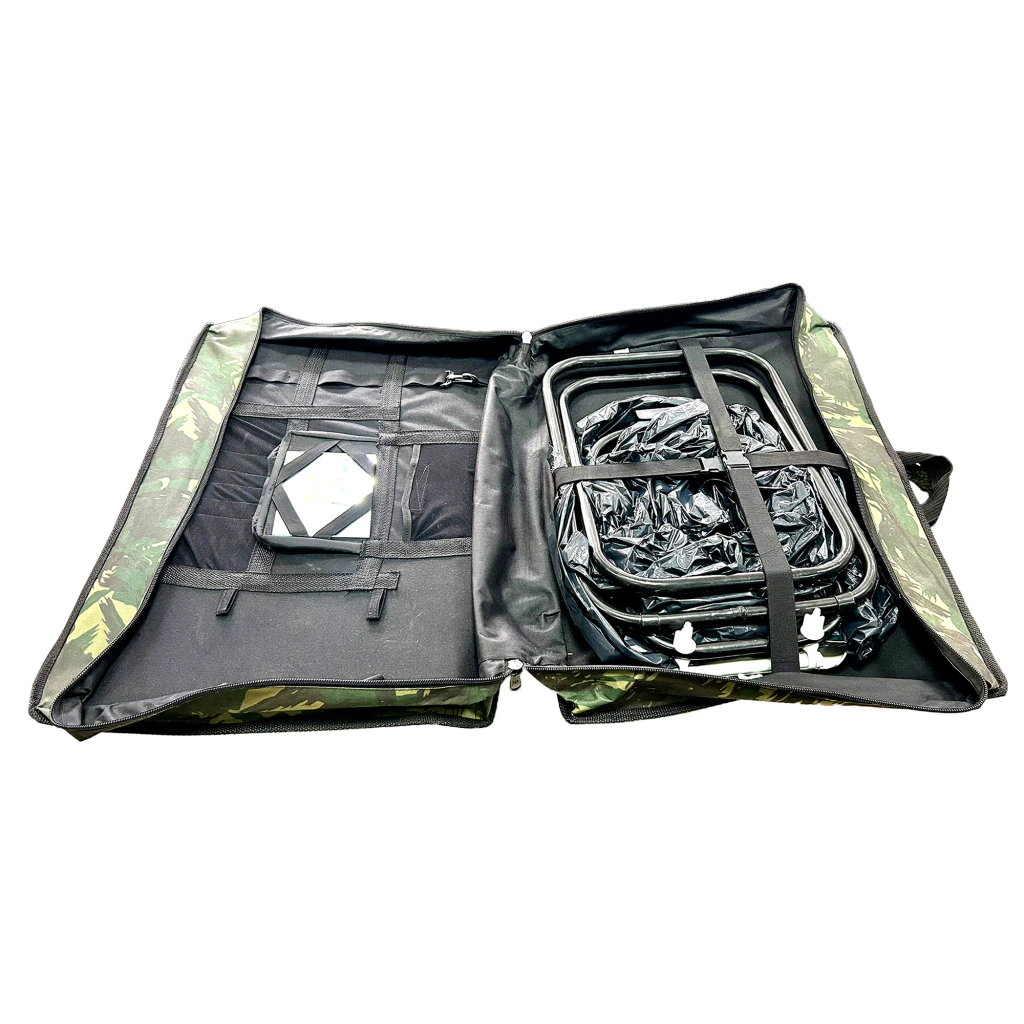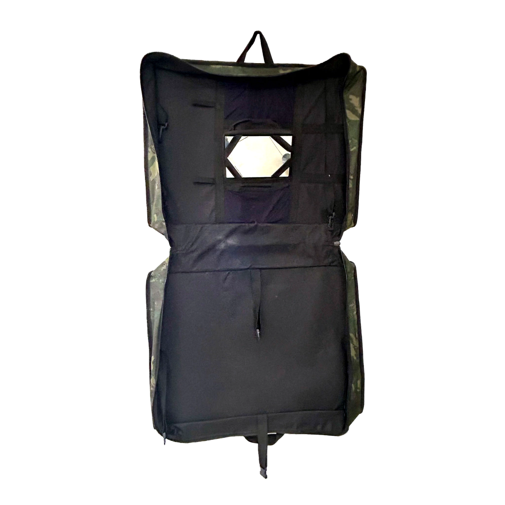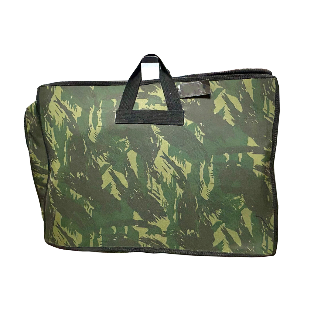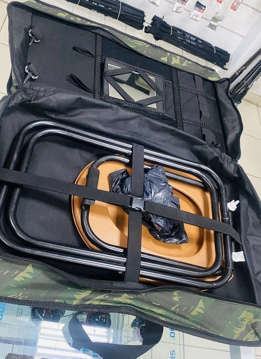 Banqueta reforçada capacidade 140 kilos, com tampa de vaso sanitário, espelho, compartimentos para papel higiênico, creme dental, escovas e capa de lona com zíper.